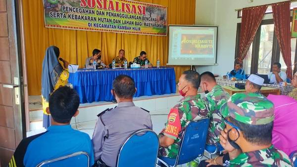 Camat Rambah Hilir H Agus Salim menggelar Sosialisasi Karhutla di aula Kantor Camat Rambah Hilir Kabupaten Rokan Hulu, bersama Danramil 02 Rambah Kodim 0313/KPR Kapten Inf Taufik Sihombing dan Kapolsek Rambah Hilir Ipda Debi Azhar.