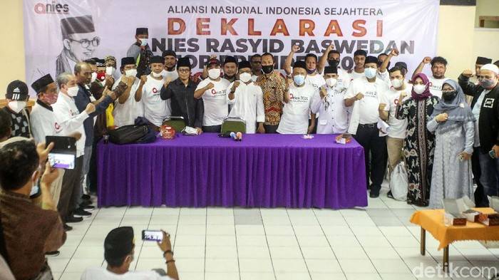 Relawan yang mengatasnamakan Aliansi Nasional Indonesia Sejahtera menggelar deklarasi Anies Baswedan for Presiden 2024 di Gedung Joeang 45, Jakarta, Rabu (20/10/2021).