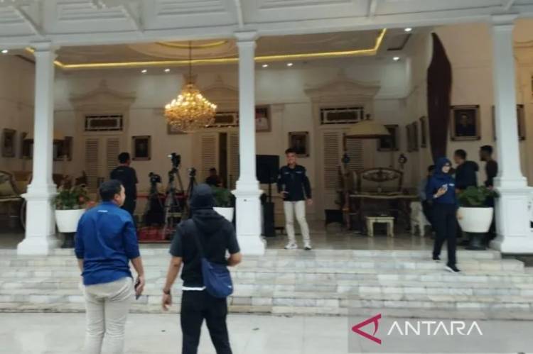 Pewarta yang sedang menunggu konfrensi pers di Pendopo Cianjur, Jawa Barat, berhamburan ke area parkir karena gempa yang kembali menguncang cukup keras terpusat di Kabupaten Garut, Sabtu (3/12/2022). ANTARA/Ahmad Fikri.