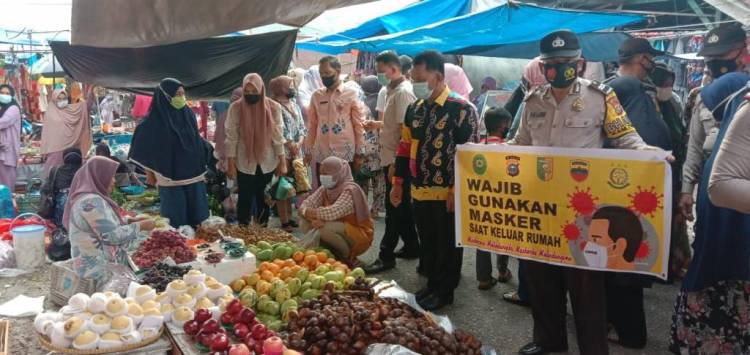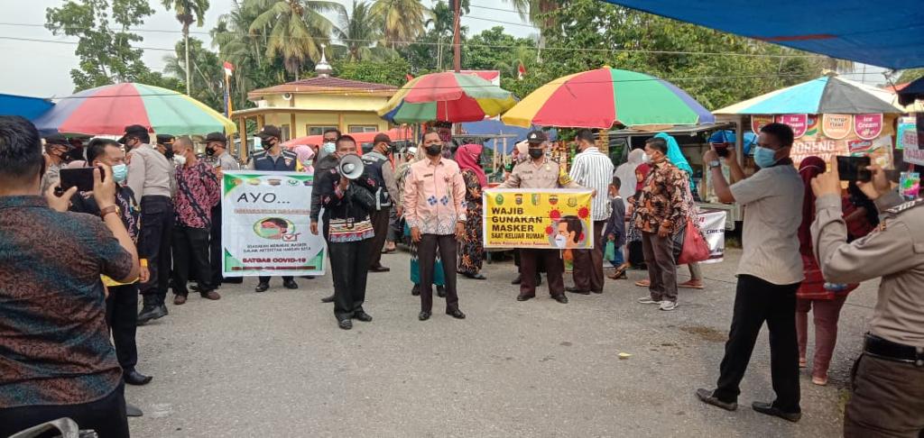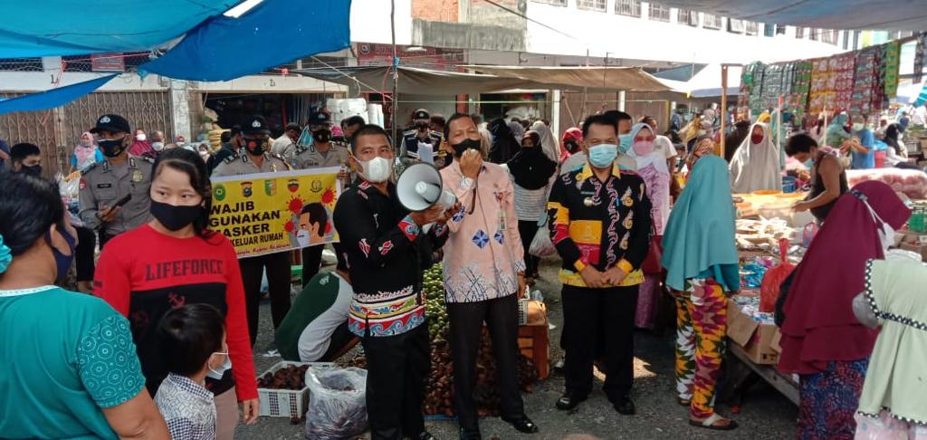 Kadis Kopdagrin Azhar didampingi Camat dan Kapolsek memberikan himbauan dan edukasi kepada masyarakat dan pedagang pasar Muara Lembu.