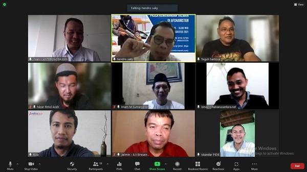 Acara diskusi Virtual JMSI Aceh dengan mengusung tema konstelasi global pasca kemenangan Taliban di Afghanistan, diikuti lebih dari 37 Perseta, dan di pandu oleh Ihsan Yunadi, CEO AnteroAceh.com