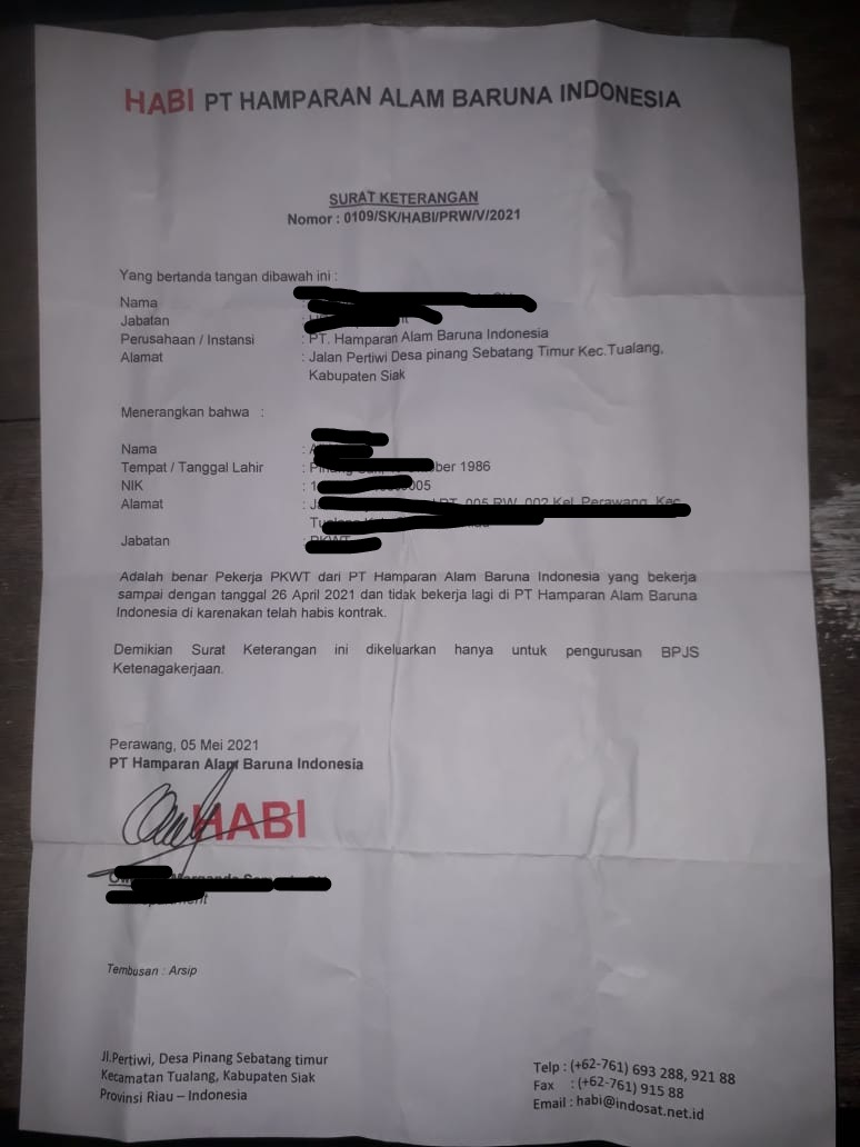 Seperti halnya yang terjadi pada salah seorang pekerja berstatus kontrak dengan Perjanjian Kerja Waktu Tertentu (PKWT) Ali Yusuf yang telah bekerja lebih kurang 9 bulan lamanya itupun diberhentikan pada 26 April 2021 dan tidak bekerja lagi di PT. HABI dikarenakan telah habis kontrak.