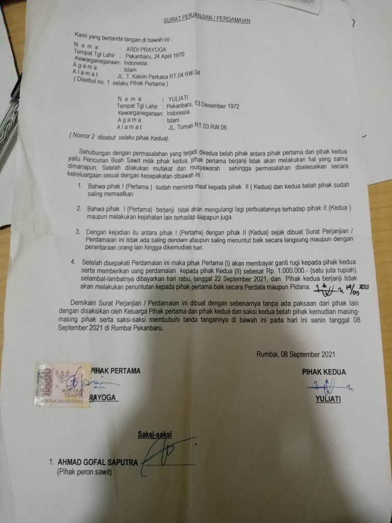 "Benar ada kita amankan tersangka anak berinsial P, tetapi saat kita mau lakukan proses lebih lanjut, ternyata orangtua si tersangka itu kenal dekat sama si korban pemilik kebun, karena mereka sudah berteman saat masih sekolah, dan mereka membuat perdamaian," ujar Kapolsek Rumbai AKP Linter Sihaloho saat di konfirmasi datariau.com, Ahad (24/10/2021).