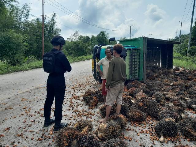 Gagal Menanjak, Truk Sawit Terguling di Tanjakan Merdeka Seberida Inhu