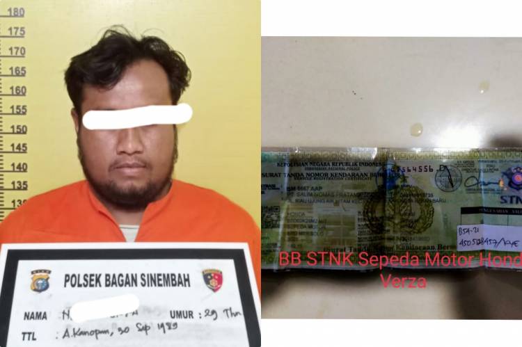 Tersangka dan barang bukti 1 lembar STNKB sepeda motor Honda Verza dengan Nopol BM 5667 AAP saat diamankan di Mapolsek Bagan Sinembah.