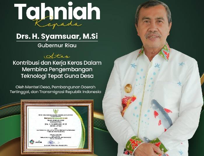 Gubernur Riau Syamsuar Dianugerahi Penghargaan Atas Kontribusi Membina Pembangunan Teknologi Tepat Guna Desa Dari Kemendes PDTT