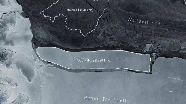 Bongkahan es berbentuk jari, yang panjangnya kira-kira 105 mil (170 kilometer) dan lebar 15 mil (25 kilometer), itu terlihat oleh satelit saat ia terlepas dari sisi barat Rak Es Ronne Antartika, menurut Badan Antariksa Eropa (ESA).