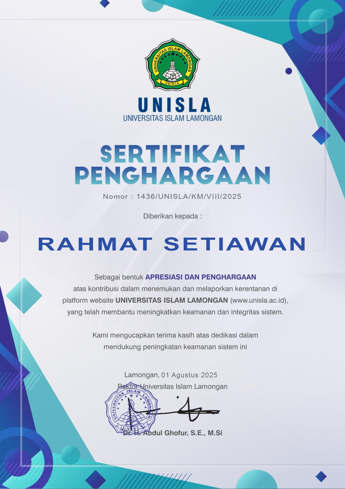 Sementara dari dunia akademik, Universitas Islam Lamongan (UNISLA) turut memberikan Sertifikat Penghargaan resmi kepada Rahmat Setiawan atas temuannya terhadap kerentanan pada sistem website kampus. Kontribusi tersebut dinilai membantu meningkatkan keamanan serta integritas sistem informasi universitas.