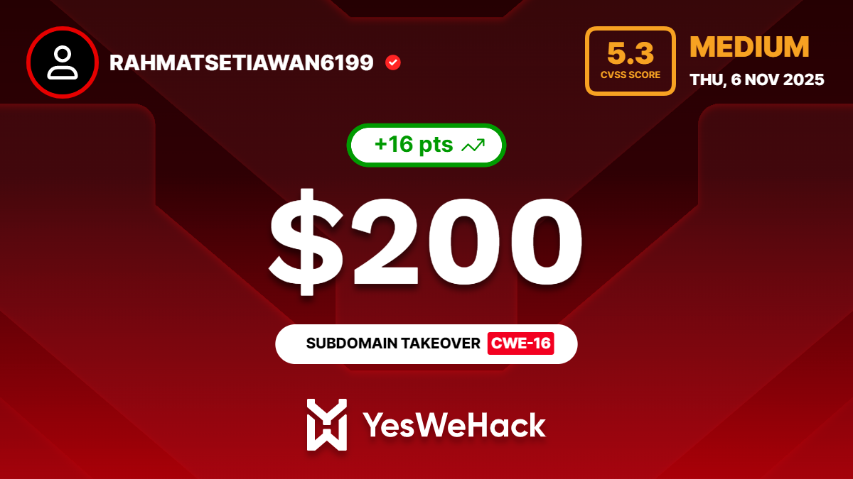 Salah satu pencapaian pentingnya yakni memperoleh reward sebesar USD 200 dari platform YesWeHack setelah berhasil menemukan celah Subdomain Takeover (CWE) dengan tingkat kerentanan medium (CVSS 5.3). Temuan tersebut dinilai valid dan memiliki dampak terhadap keamanan sistem.