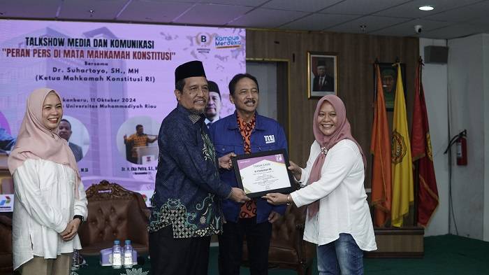 Kegiatan yang dihadiri ratusan mahasiswa Fakultas Ilmu Komunikasi Universitas Muhammadiyah Riau (Fikom-UMRI) mengangkat tema “Peran Pers di Mata Mahkamah Konstitusi” merupakan kolaborasi antara Forum Jurnalis Perempuan Indonesia (FJPI) Provinsi Riau dan Fikom UMRI.