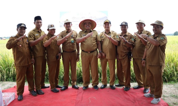 SIAK, datariau.com - Bupati Siak Drs H Alfedri MSi ikut serta panen raya padi di lahan sawah milik Kelompok Tani Makmur, Dusun I Endah Darma, Kampung Bungaraya, Kecamatan Bungaraya, Kabupaten Siak, Riau, Senin (13/11/2023).