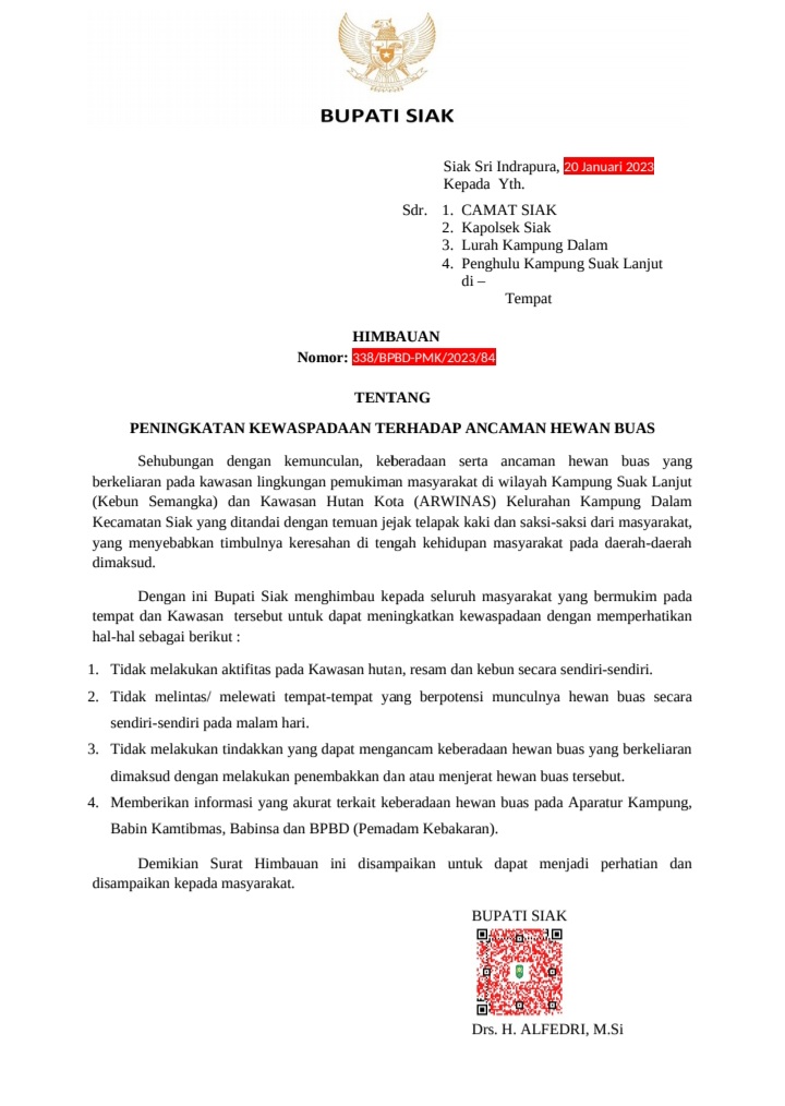 Harimau Masuk Hutan Kota, Bupati Siak Imbau Masyarakat Tingkatkan Kewaspadaan