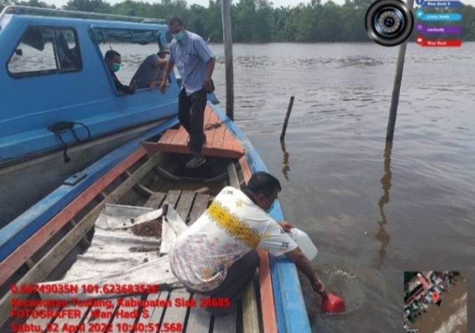 Dinas Lingkungan Hidup (DLH) Siak melalui Bidang Penataan, Penanganan Lingkungan Hidup dan Kehutanan DLH Kabupaten Siak saat pengambilan sampel air aliran sungai Siak.
