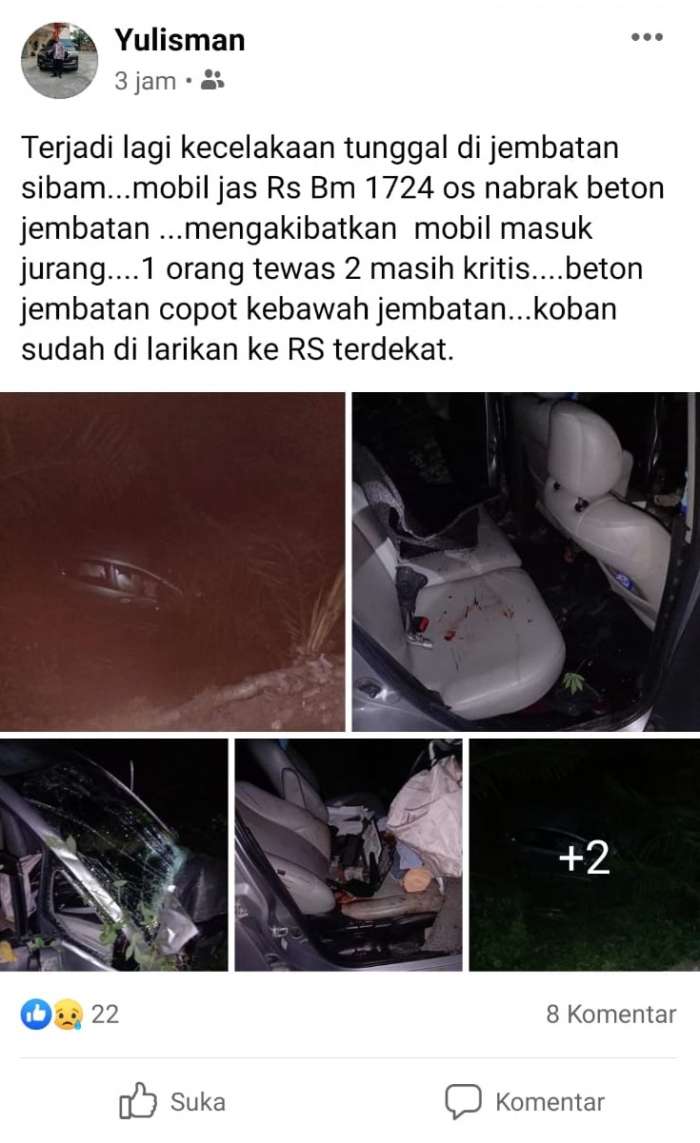 Honda Jazz Tabrak Beton Jembatan Sibam Garuda Sakti, 1 Orang Dikabarkan Meninggal, 2 Kritis