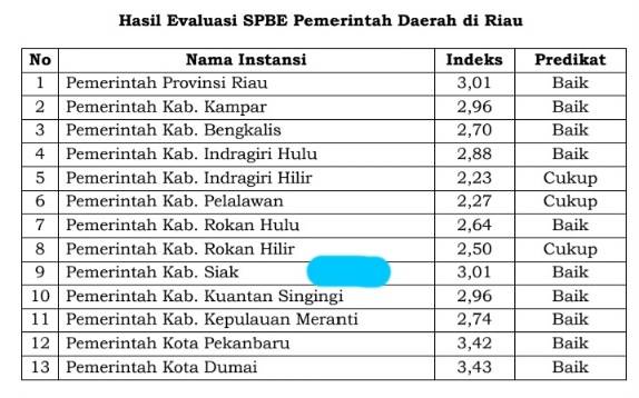 Semula indeks SPBE Kabupaten Siak tahun 2022, dan berada di angka 2,34. Sementara, untuk tahun 2023, naik menjadi 3,01 dengan predikat, 'Baik'.