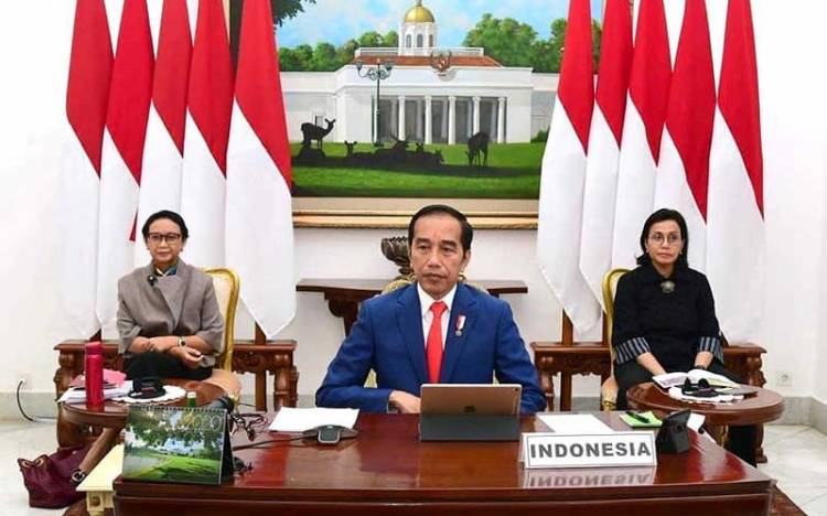 Presiden Jokowi Didampingi Menteri Luar Negeri Retno Marsudi dan Menteri Keuangan Sri Mulyani Indrawati di KTT Luar Biasa G20 Tahun 2020 Secara Virtual