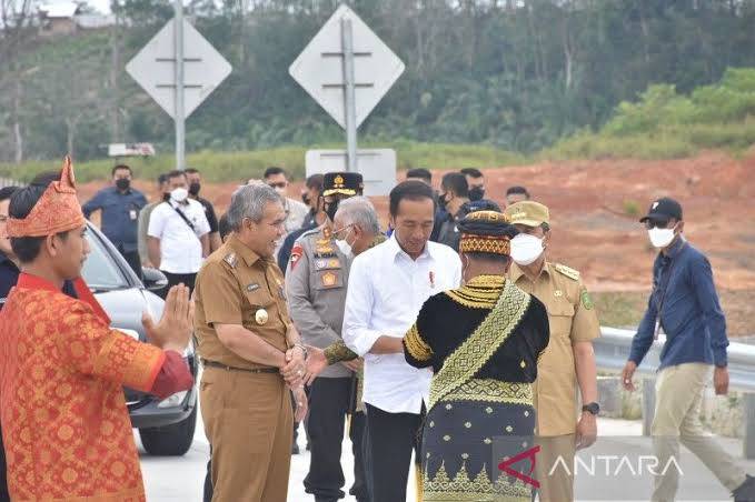 Presiden Jokowi disambut dengan pakaian adat saat berkunjung ke Kabupaten Kampar beberapa waktu lalu.
