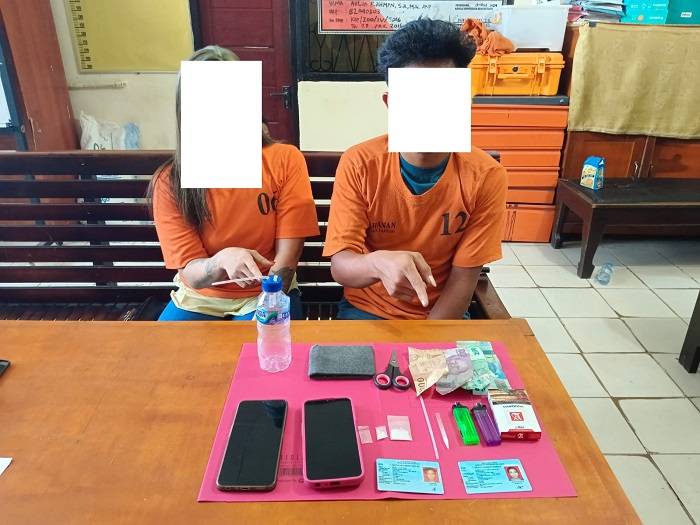 Sepasang kekasih dan barang bukti sabu yang diamankan polisi.
