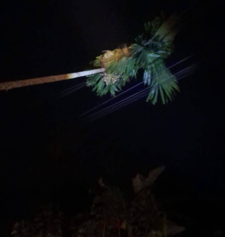 Tampak pohon pinang tumbang menimpa dan tersangkut di kabel listrik PLN di Jalan Sertu Kubang, mengakibatkan listrik padam di Desa Tarai Bangun, Senin (24/3/2025) tengah malam.