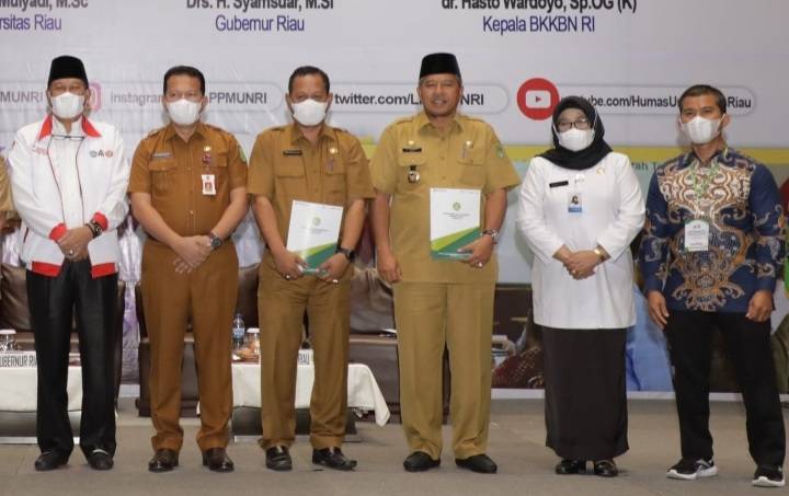 Prosesi serah terima mahasiswa Kukerta ditandai dengan diterimakanya secara simbolis buku daftar nama Mahasiswa Kukerta dari Ketua LPM Universitas Riau Almasdi Syahza disaksikan Rektor Aras Mulyadi Kepada Bupati Siak Alfedri, bersempena kegiatan Kuliah Umum oleh Kepala BKKBN RI Hasto Wardoyo yang dilaksanakan di Gedung SKA Co Ex Pekanbaru, Senin (11/7/2022).
