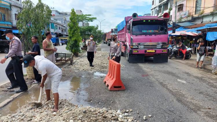 Kapolsek Bagan Sinembah Timbun Jalan Berlubang di Pajak Lama