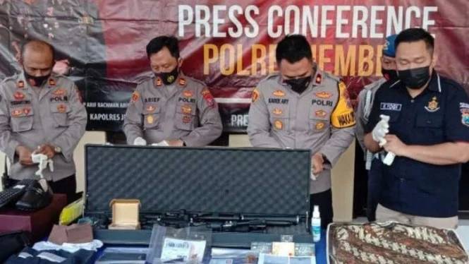 Wakil Kepala Polres Jember Kompol Kadek Ary Mahardika (dua dari kanan) saat menggelar konferensi pers di kantor Polsek Wuluhan Jember, Rabu, 26 Mei 2021.