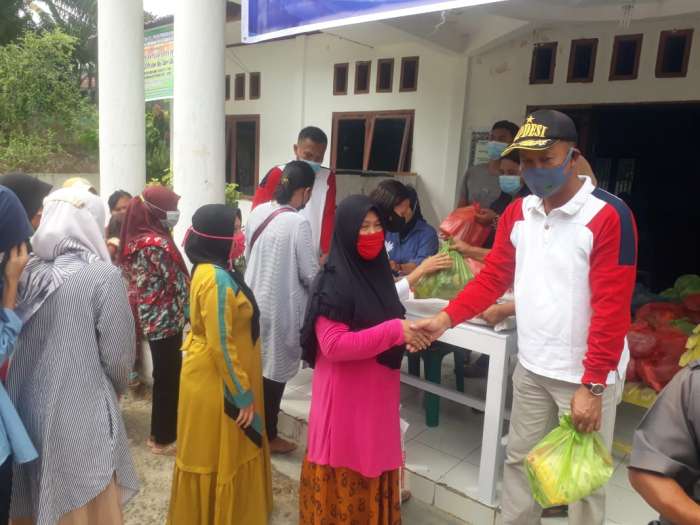 Pengulu Bagan Manunggal Johan Taruna saat menyalurkan sembako pasar murah kepada warga masyarakat.