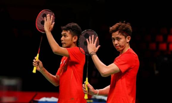 Pasangan ganda putra Indonesia, Fajar Alfian/Muhammad Rian Ardianto, melakukan selebrasi usai memenangi pertandingan melawan Thailand pada Senin (11/10/2021).