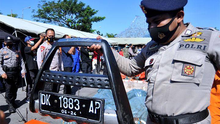 Petugas mengangkut komponen mobil penumpang KMP Yunicee di Pelabuhan Gilimanuk, Jembrana, Bali, Rabu, 30 Juni 2021. Badan Nasional Pencarian dan Pertolongan (Basarnas) Surabaya, Jawa Timur, menurunkan satu Kapal Negara (KN) SAR Permadi dan dua un