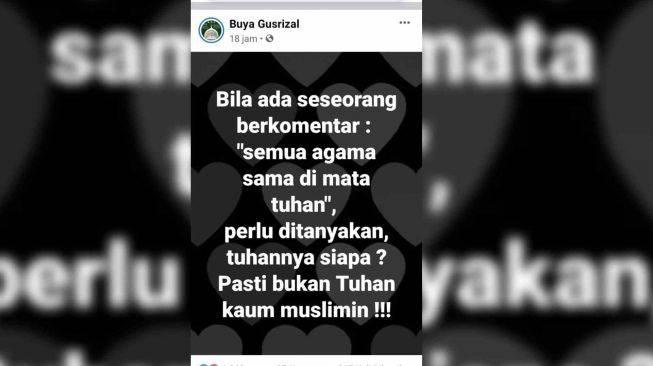 Baru-baru ini, Buya Gusrizal menulis sebuah ulasan di akun Facebook resminya, @Buya Gusrizal yang dikutip SuaraSumbar.id, Jumat (17/9/2021). Di situ, Buya menyebut pernyataan semua agama benar adalah pandangan sesat.