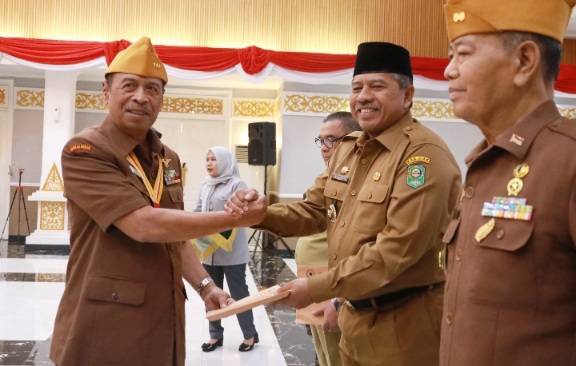 PEKANBARU, datariau.com - Wakil Ketua Umum II Legiun Veteran Republik Indonesia (LVRI) Marsdya TNI (Purn) Wresni Wiro memberikan tanda penghargaan Bintang Legiun Veteran Republik Indonesia kepada Bupati Siak Drs H Alfedri MSi.