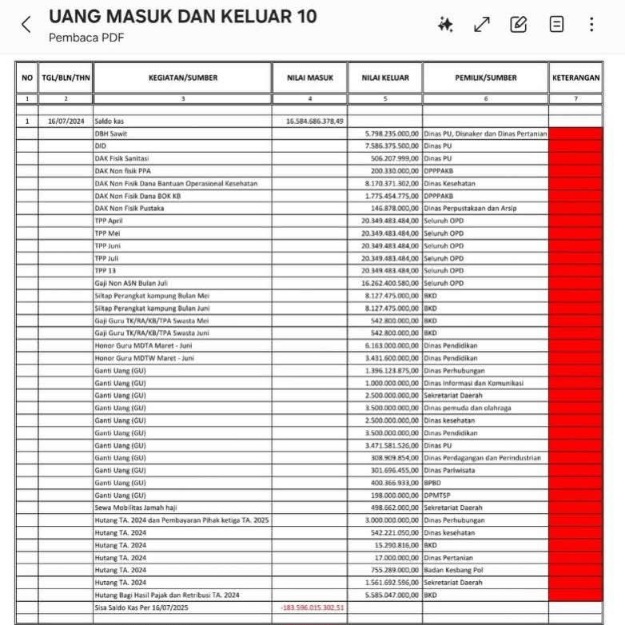 Dikatakan Afni, saya kasi contoh, foto di bawah ini adalah bentuk laporan keuangan (secara manual dari staff) tentang kondisi kas Pemkab Siak per tanggal 16 Juli 2025.
