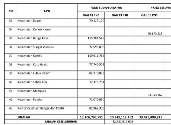 "Saya tetap bersyukur, meski fiskal Pemkab Siak begitu sempit, kami sudah membayarkan gaji ke-13 pegawai (meski baru satu item), melunasi beberapa utang dan membayarkan beberapa kegiatan di OPD krusial," jelas Afni.