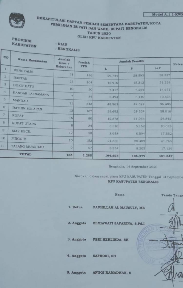 KPU Bengkalis Tetapkan 381.347 DPS Pilkada 2020