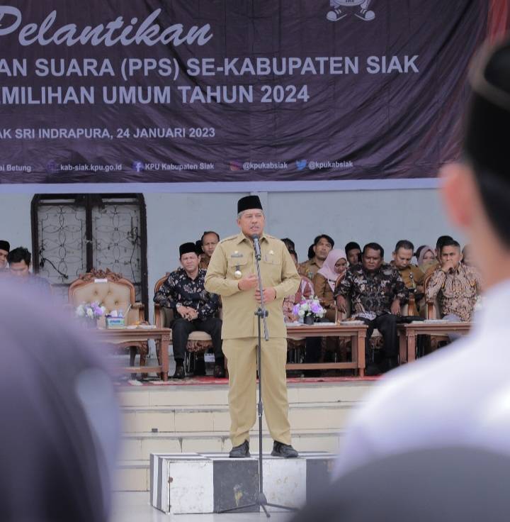 Bupati Siak Drs H Alfedri MSi pada pelantikan PPS se-Kabupaten Siak di lapangan Siak Bermadah.