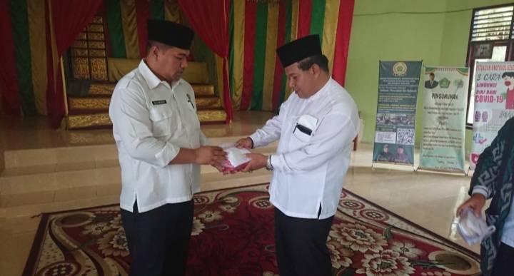 Kepala KUA Tualang, Najamudin, S.Hi serah donasi langsung kepada Kemenag Siak melalui Kasi Bimas Islam, Harman, S.Ag.