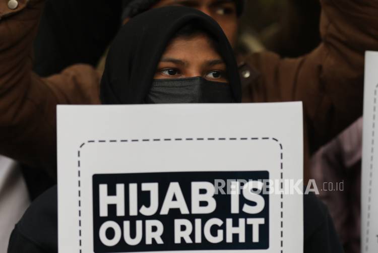 Foto: Aktivis mahasiswa India dari Muslim Students Federation (MSF) memegang plakat selama protes terhadap pembatasan jilbab, di New Delhi, India, 08 Februari 2022.