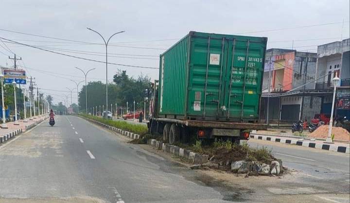 Truk kontainer BM 9649 AS menabrak pembatas (median) jalur 2 depan Kantor Camat Tualang, Kamis (29/9/2022) sekira pukul 07.30 WIB.