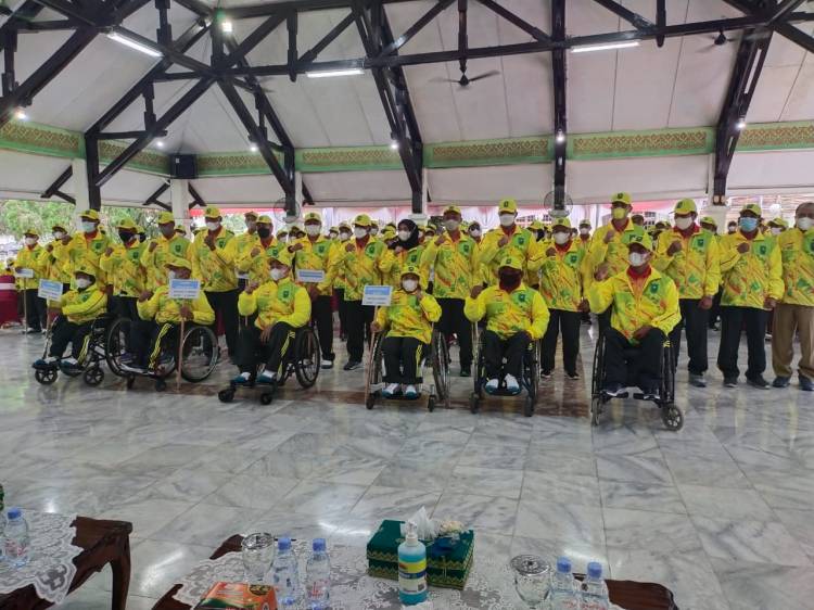 Foto : Pelepasan kontingen Riau dalam mengikuti event Peparnas XVI, di Balai Pelangi, Komplek Rumah Dinas Gubernur Riau, Senin (1/11/2021).