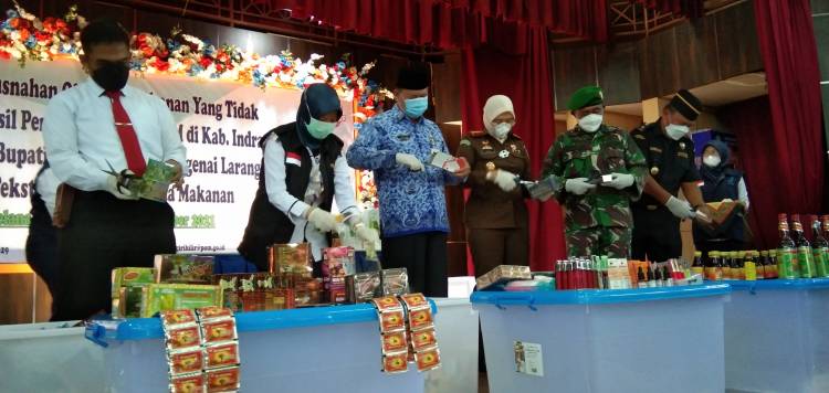 TEMBILAHAN, Datariau.com - Loka Pengawasan Obat dan Makanan Kabupaten Inhil memusnahkan Obat dan Makanan Yang Tidak Memenuhi Ketentuan Hasil Pengawasan Loka POM di Kabupaten Inhil, serta Publikasi Surat Edaran Bupati Inhil Mengenai Larangan Penggunaan Pewarna Tekstil Rhodamin B Pada Makanan Gedung Engku Kelana, Tembilahan, Senin (29/11/21).