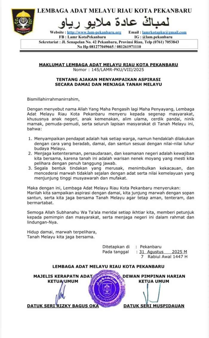 Maklumat LAMR Kota Pekanbaru: Penyampaian Aspirasi Adalah Hak Setiap Warga, Lakukan dengan Cara Santun!