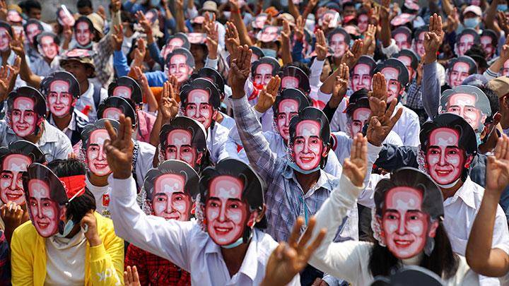 Para pengunjuk rasa yang mengenakan topeng yang menggambarkan pemimpin yang digulingkan Aung San Suu Kyi, memberikan hormat tiga jari saat mereka mengambil bagian dalam protes terhadap kudeta militer di Yangon, Myanmar, 28 Februari 2021.