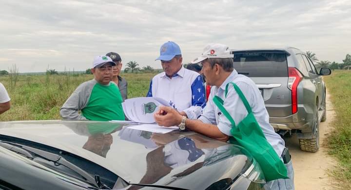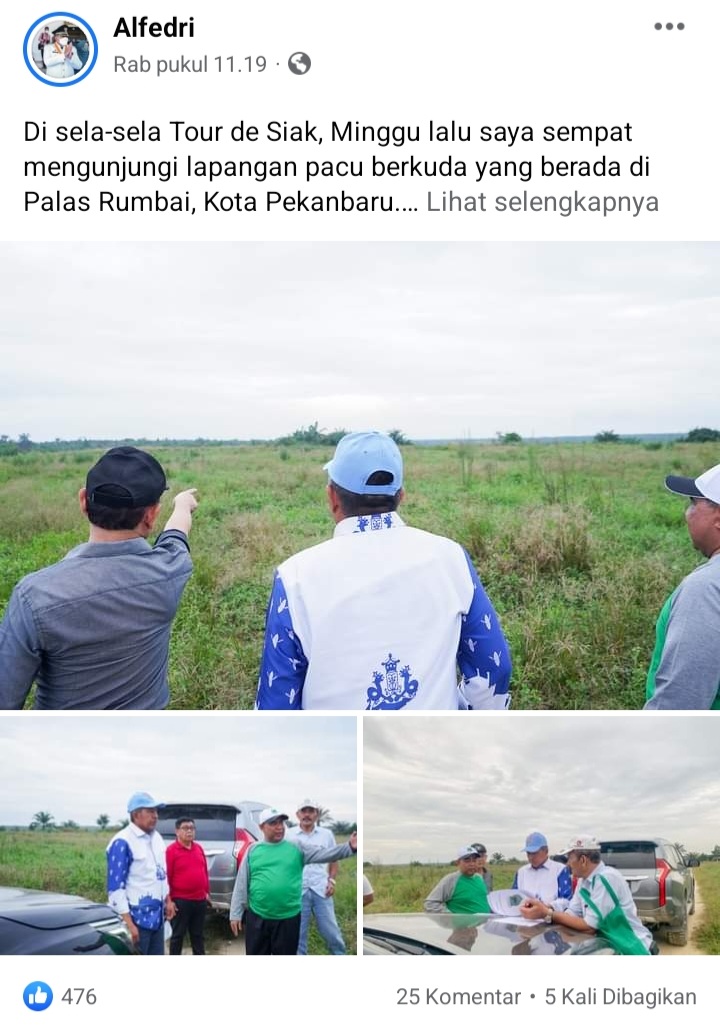 Ketua Umum Pengurus Pordasi Provinsi Riau sekaligus Bupati Siak Drs H Alfedri MSi saat tinjau lapangan pacu berkuda di Kelurahan Palas, Rumbai, Pekanbaru, Riau.