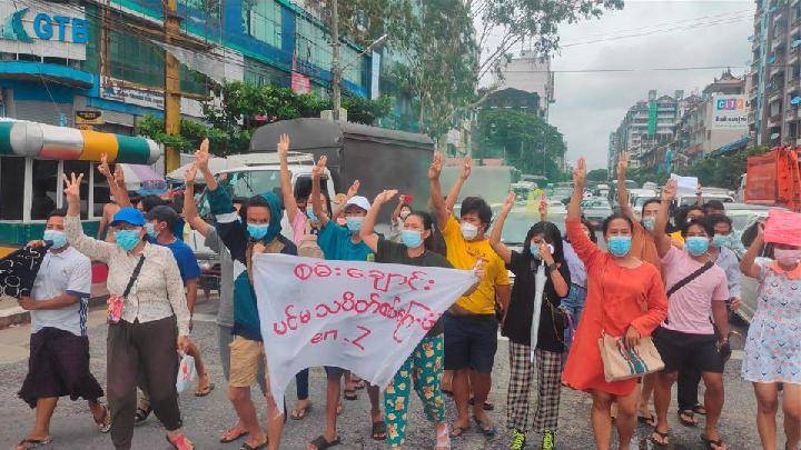 Demonstran menunjukkan salam tiga jari selama protes untuk solidaritas terhadap Pasukan Pertahanan Rakyat Mandalay, di Yangon, Myanmar 22 Juni 2021, dalam tangkapan layar yang diperoleh Reuters dari video media sosial.[REUTERS]