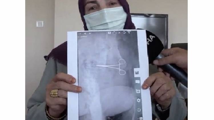 Nurcihan Ogmen menunjukkan foto rontgen yang memperlihatkan gunting bedah bersemayam di perutnya. (Foto: Newsflash)