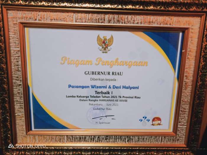 Pasangan Asal Pulau Lawas Bangkinang Raih Terbaik I Keluarga Teladan Tingkat Provinsi Riau 2021