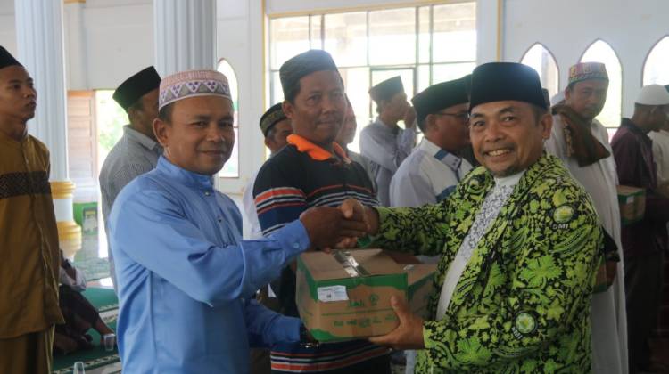 Usai memberikan sambutan Ketua PD DMI Rohil H Wazirwan Yunus SSos MSi dan jajaran pengurus, menyerahkan satu paket kebersihan kepada Ketua DKM masjid/musholla Se-Kecamatan Rimba Melintang. (sul).