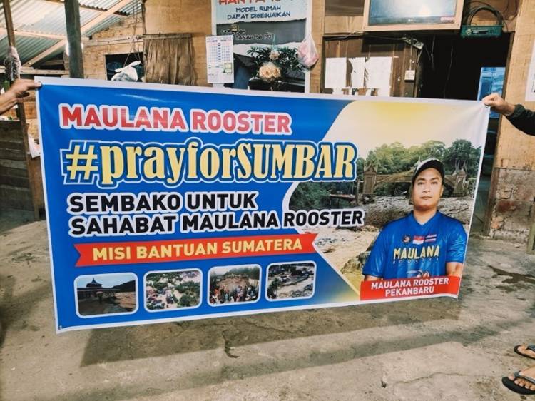 Pengusaha ayam asal Pekanbaru, Maulana Rooster, menyalurkan bantuan kepada masyarakat terdampak bencana di Sumatera Barat.