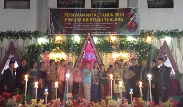 SIAK, datariau.com - Ratusan pemuda pemudi dari denominasi gereja di Kecamatan Tualang menghadiri perayaan Natal Pemuda Kristiani Tualang, di Aula Tapian Nauli, Ahad (19/12/2021) sekira pukul 19.00 Wib. Bertindak sebagai pengkotbah yakni Pendeta Jauno Siregar STh dari Gereja Tuhan Di Indonesia.