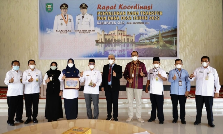 Penghargaan ini diserahkan oleh Kepala Kantor Wilayah Direktorat Jenderal Perbendaharaan Provinsi Riau Ismet Saputra, kepada Bupati Siak yang diwakili oleh Sekretaris Daerah Kabupaten Siak Arfan Usman, pada acara Rapat Koordinasi Penyaluran Dana Transfer dan Dana Desa tahun 2022, yang dilaksanakan di Balairung Datuk 4 Suku, Komplek Perumahan Abdi Praja, Kecamatan Siak, Rabu (8/12/2021).